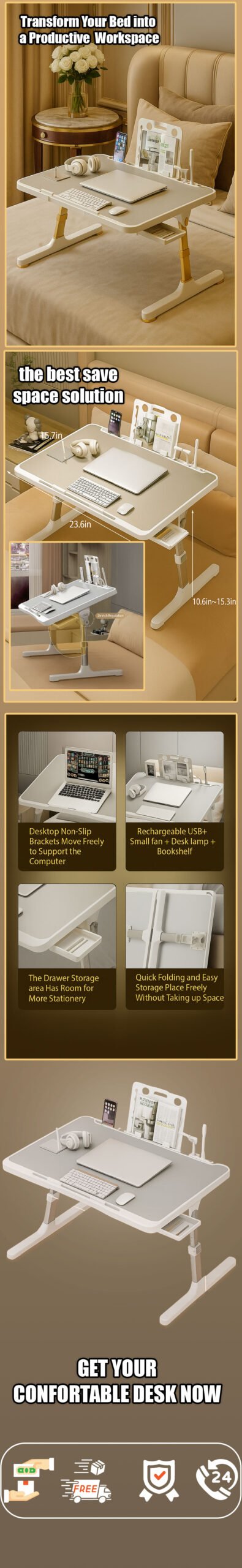 Laptop Desk for Bed, Adjustable Bed Table with USB Charge Port