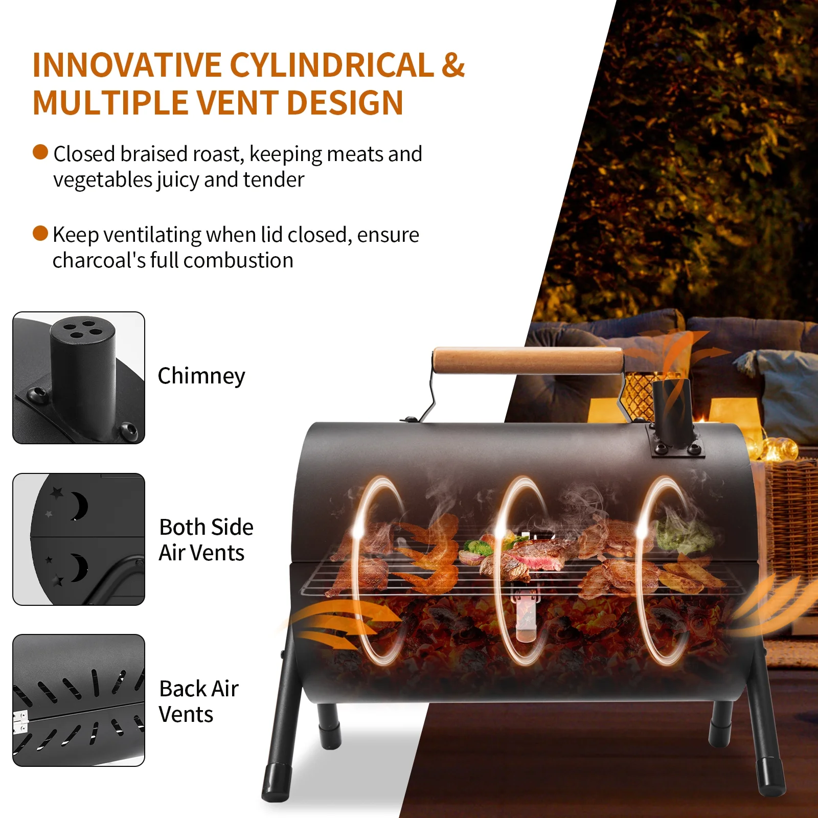Equipped with a vertical cylindrical chimney that delivers efficient airflow, ensuring a safe and consistent heating environment. Air vents help maintain charcoal combustion and distribute heat and flavor evenly across your food.